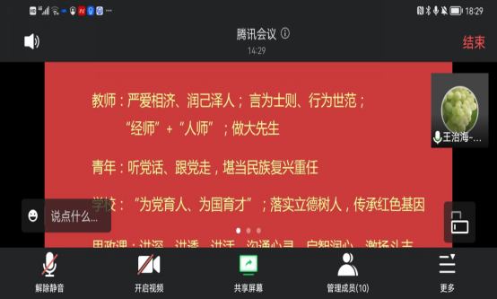 2022年4月25日上午,中共中央总书记、国家主席、中央军委主席习近平来到中国人民大学考察调研并发表重要讲话。为深入学习贯彻习近平总书记在中国人民大学考察时重要讲话精神, 5月11日下午304永利登录入口教工第一党支部组织全体党员认真学习讲话精神,并开展主题党日活动。王治海副院长以《推进课程思政建设 践行立德树人使命》为题,联系实际,结合自己学习习近平总书记重要讲话精神的体会,通过腾讯会议给大家讲了一堂专题党课。