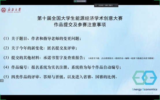 周建力老师就第十届全国大学生能源经济学术创意大赛作品提交及参赛注意事项进行了详细介绍,首先是关于题目、作者和指导老师的变更问题,其次是今年赛事的新变化以及需提交的承诺书和查重报告等材料,最后是四类作品的评审、答辩与晋级。