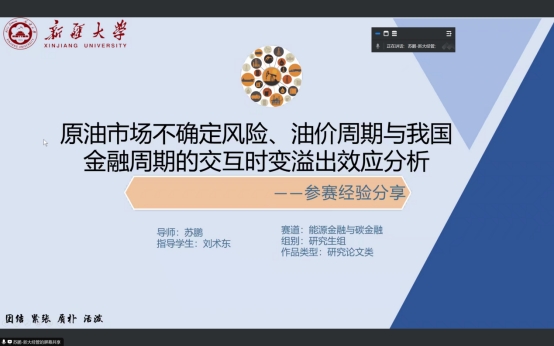 苏鹏老师就参加第九届全国大学生能源经济学术创意大赛的经验进行了分享,围绕着参赛作品的选题、主要内容、参赛大致历程以及参赛的感想与启示进行了详细介绍。苏鹏老师提到,第九届参赛作品的研究主题分为传统能源和新能源,自己所带参赛学生的作品聚焦于传统能源中的能源金融领域,在能源产品的金融属性越来越强的背景下,越来越多的学者研究能源市场与金融市场风险的交互溢出,重要的是最终入围国赛作品中共有6篇与自己团队的主题和方法较为贴近。最后,苏鹏老师强调,之所以能够获奖,最重要的归功于参赛学生刘术东对学术的满腔热情以及对作品的不断打磨,并鼓励本次参赛的同学们以最佳的状态迎接赛事,取得自身最好的成绩。