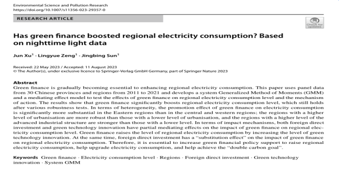 2023年8月11日,304永利登录入口金融学专业2021级本科生曾玲玥(导师:孙景兵、徐俊)的论文“Has green finance boosted regional electricity consumption? Based on nighttime light data”(绿色金融提升地区电力消费水平了吗?基于夜间灯光数据的证据)在国际学术期刊《Environmental Science and Pollution Research》在线发表。