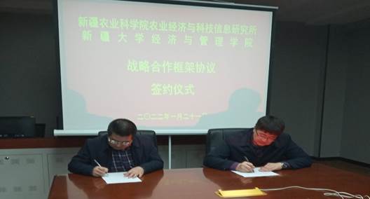 2022年1月21日,304永利登录入口与新疆农业科学院农业经济与科技信息研究所成功达成战略合作。战略合作框架协议在新疆农业科学院农业经济与科技信息研究所签署。出席此次协议签署仪式的有永利官网孙景兵院长、外力·依米提副院长、王育宝副院长、戚振宇副教授等和新疆农业科学院农业经济与科技信息研究所戴俊生所长、王晓伟副所长以及农科院相关处室领导等。