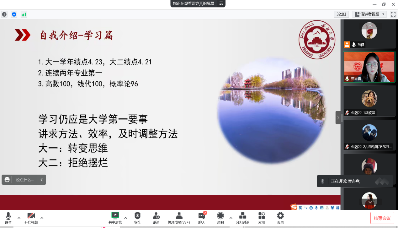 第一位分享的是金融20-3班的贾亦真同学,她从学习、竞赛、学术、社会实践、荣誉方面对自身情况做出了简要介绍,她强调要转变思维,拒绝“摆烂”,勇敢追求更多可能性。并分享自己的学习方法和经验,鼓励同学们善于把握自我发展的机会,保持专注,追求效率,找准定位,走好自己的路。在师生评价环节,贾亦真的班级同学、舍友和班主任赵玉强老师说她是一个谦虚且上进的学生,给予了高度评价。