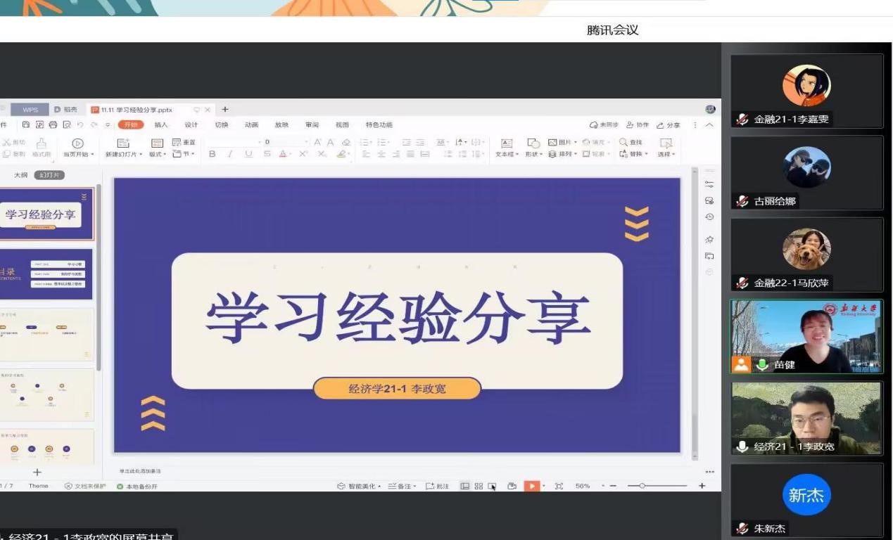 金融20-3贾亦真,金融21-1李嘉雯,经济21-1李政宽等3名学生在2021-2022学年初修课程(不含通识教育选修课)平均学分绩点达到4.2及以上,根据《304永利登录入口学分奖励实施细则(试行)》规定,获得3学分的奖励。为进一步营造永利官网浓厚学风,树立和培养学生先进典型,充分发挥优秀学生的榜样示范作用,激励先进、鞭策后进,使同学们跨越迷惘,汲取知识的高光,挑战智慧的交锋,进一步明确在大学阶段的学习定位和学习目标。304永利登录入口于2022年11月11日16:00通过腾讯会议+钉钉直播开展高分“学霸”学习经验分享交流会,永利官网高度重视本次活动的开展,组织学院大一大二全体学生以及学院领导老师积极参与到本次活动当中。在此次分享会中,“学霸”们将自己的学习方法与经验分享给大家,希望大家能通过此次分享汲取榜样力量,向着自己的目标不断前进。