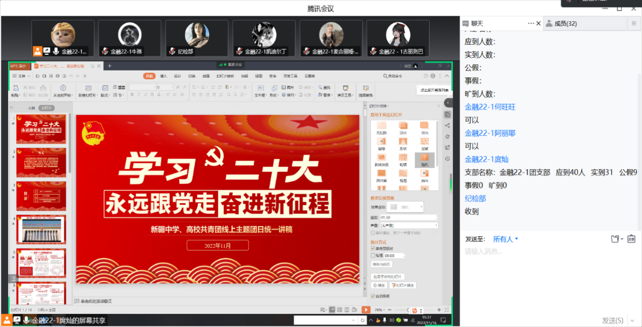 党的二十大是在我国迈上全面建设社会主义现代化国家新征程、向第二个百年奋斗目标进军的关键时刻召开的一次十分重要的大会,举国关注、世界瞩目。党的二十大从战略全局深刻阐述了新时代坚持和发展中国特色社会主义的一系列重大理论和实践问题,科学谋划了未来一个时期党和国家事业发展的目标任务和大政方针,在党和国家历史上具有重大而深远的意义。304永利登录入口于2022年11月16日通过线上团课的形式开展“学习二十大、永远跟党走、奋进新征程”主题团日活动,学院高度重视本次活动的开展,提前下达学习要求,组织学生积极参与活动。