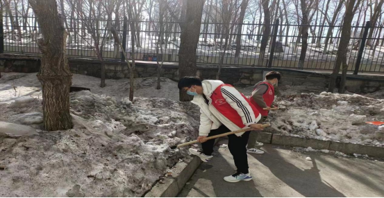 在室外,男同学们干劲十足,拿起铁锹清理离退休服务中心周围的积雪,累的满头大汗,但是乐在其中。春风暖暖,冰消雪融,激发了同学们弘扬雷锋精神,自觉关爱老人的积极性。