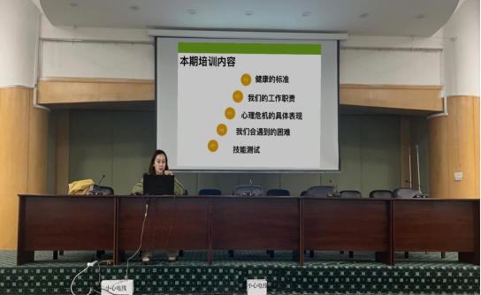接下来培训开始,开丽老师通过“健康的标准”、“我们的工作职责”、“心理危机的具体表现”、“我们会遇到的困难”以及“技能测试”等五个方面来进行了讲述。学生们热情高涨,认真听讲,积极参与讨论。老师首先通过“五快”和“三良好”来详细的讲述了健康的标准。