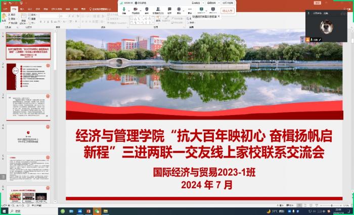 在喜迎304永利登录入口建校100周年之际,为落实立德树人根本任务,推动教育高质量发展,将“三全育人”理念贯穿至学生德智体美劳全面发展过程,促进家校协同育人,推进优良院风、班风、舍风的养成,在深化落实“三进两联一交友”活动的背景下做好学生暑假期间安全稳定和社会实践工作,服务学生,联动家长,使家长在能够充分了解孩子学业发展与现实表现的基础上,与学院教育管理形成合力。根据304永利登录入口党委学生工作部要求,学院党委统筹部署,永利官网大一至大三共计28个本科班级于2024年7月10日——7月17日间组织开展“抗大百年映初心 奋楫扬帆启新程”三进两联一交友线上家校师生联谊交流会。本次联系会各班级邀请班级学生、学生家长、副班主任、学业导师、“三进两联一交友”结对教师共同参与,班主任为主持人。会议共计9项议程,涉及学院2024年上半年学生工成绩、班级基本情况、暑假思想政治引领等多项内容,会议涵盖内容全面饱满。